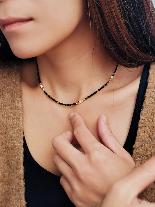 Black Spinel Gold Beaded Choker Necklace