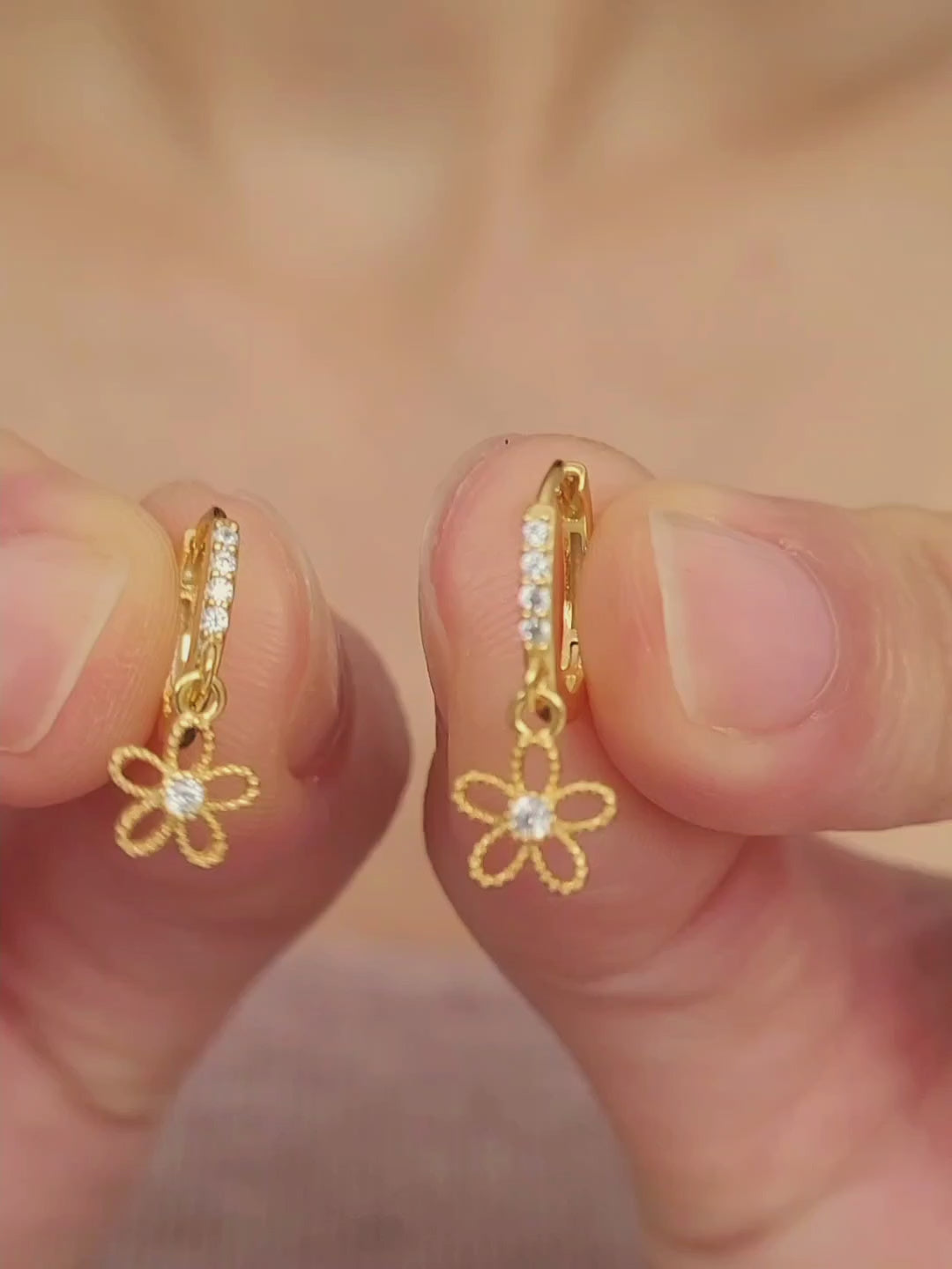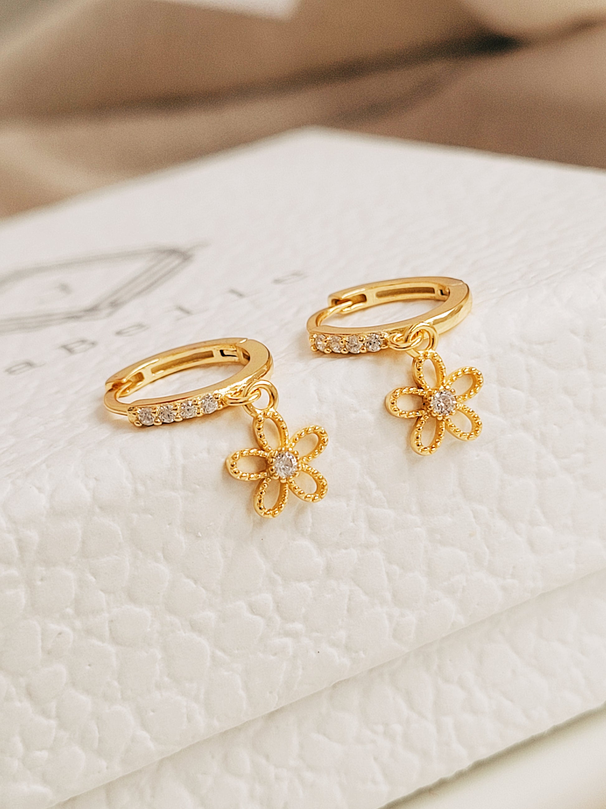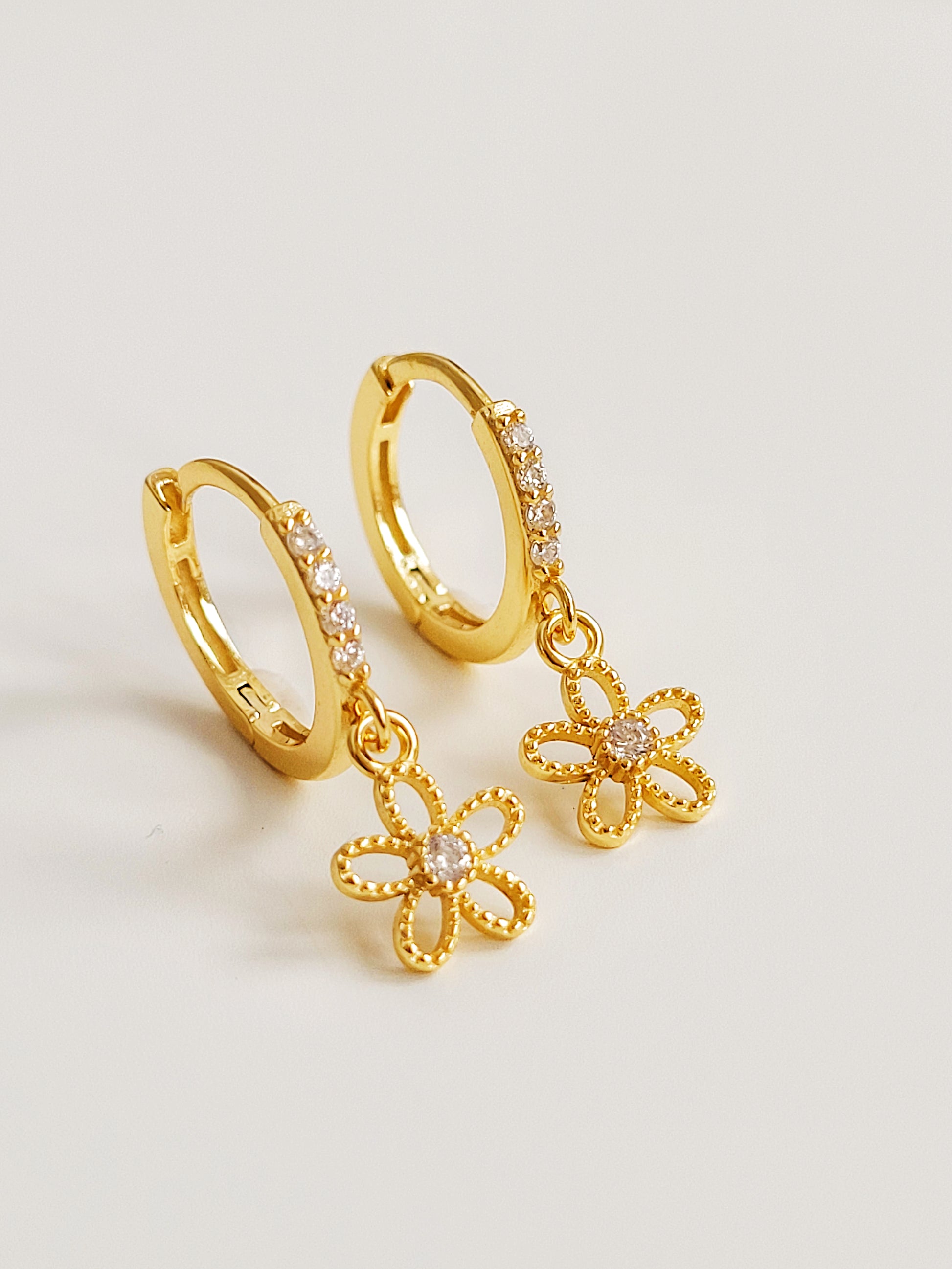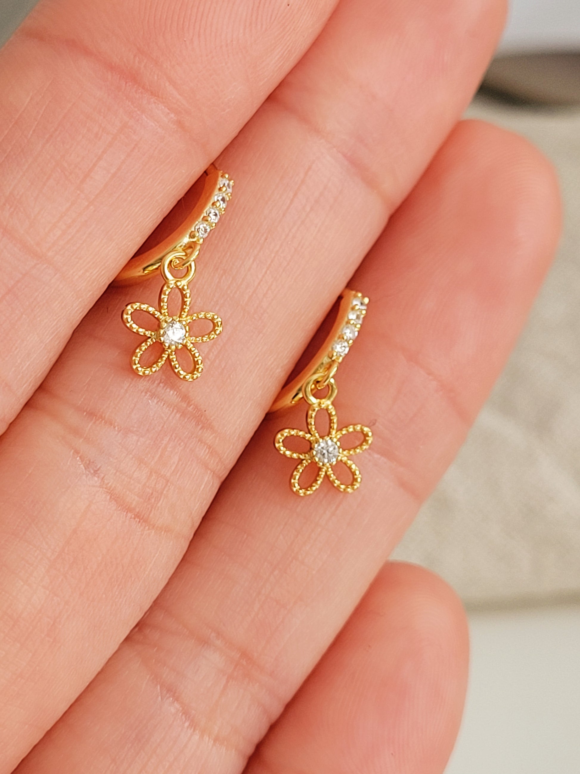 These dainty flower huggie earrings are the perfect blend of elegance and charm. Featuring a small gold hoop adorned with a delicate dangling flower, crafted in gold plated sterling silver. The intricate flower design adds a touch of femininity, making them ideal as wedding jewellery, a bridesmaid gift, or a thoughtful present for her.