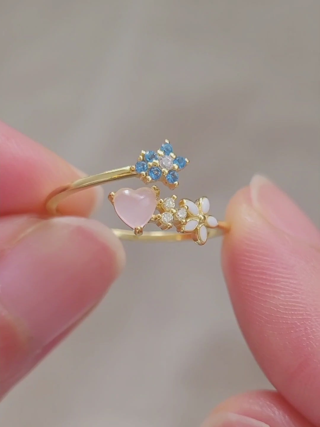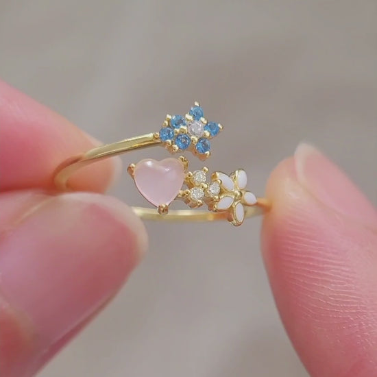 This enchanting dainty forget me not ring showcases a delicate arrangement of moonstone and blue zircons, set in a charming floral design with a luxurious gold finish. The subtle sparkle and ethereal beauty of the moonstone make this ring a stunning choice for adding a hint of elegance to any outfit.