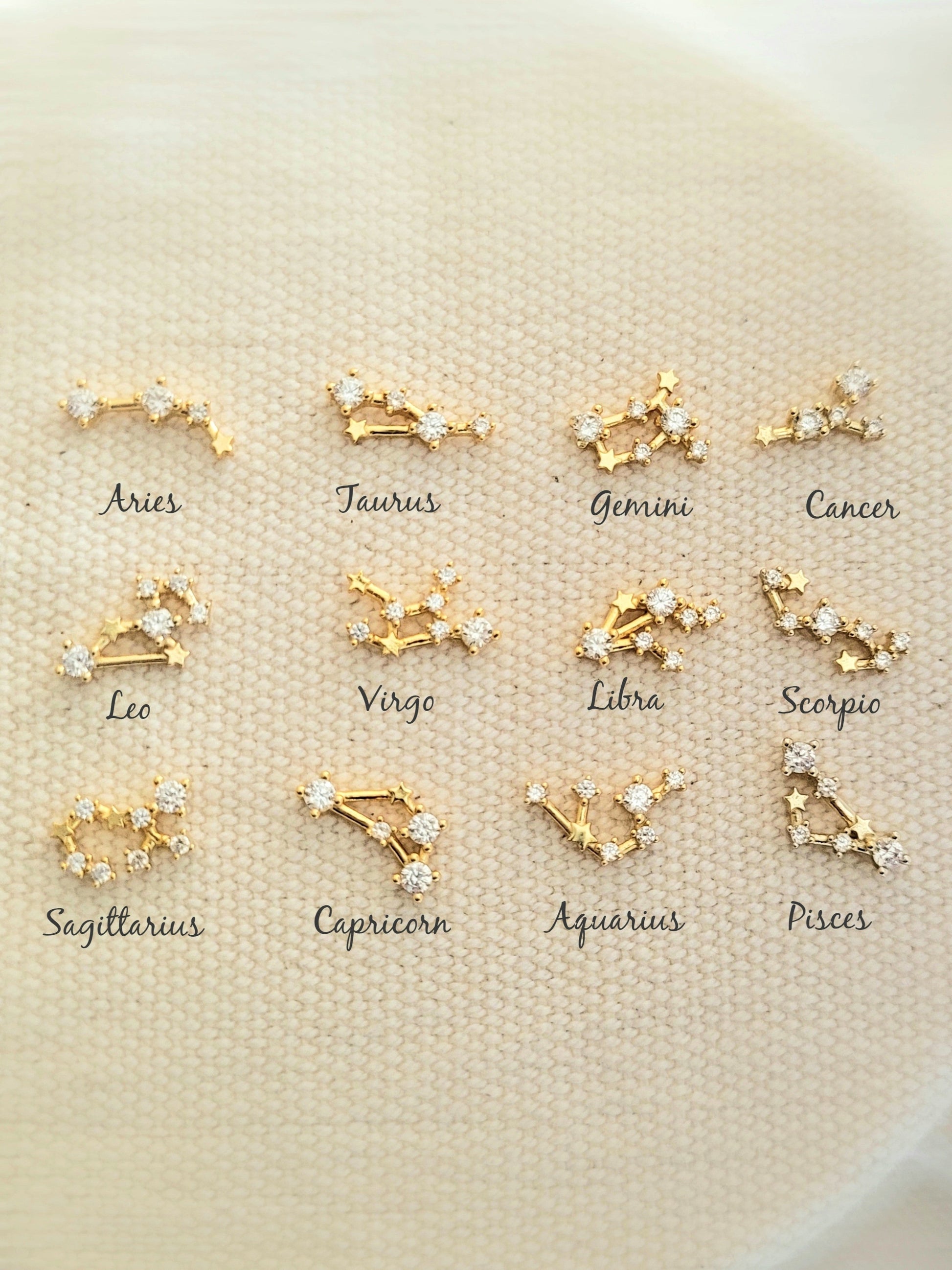 Radiate your joy, happiness and unique personalities by wearing this Starry Zodiac Earring. This stunning earring features glowing zirconia stones and stars to form your zodiac sign’s celestial constellation. Perfect to wear it alone or stack to create your own style.